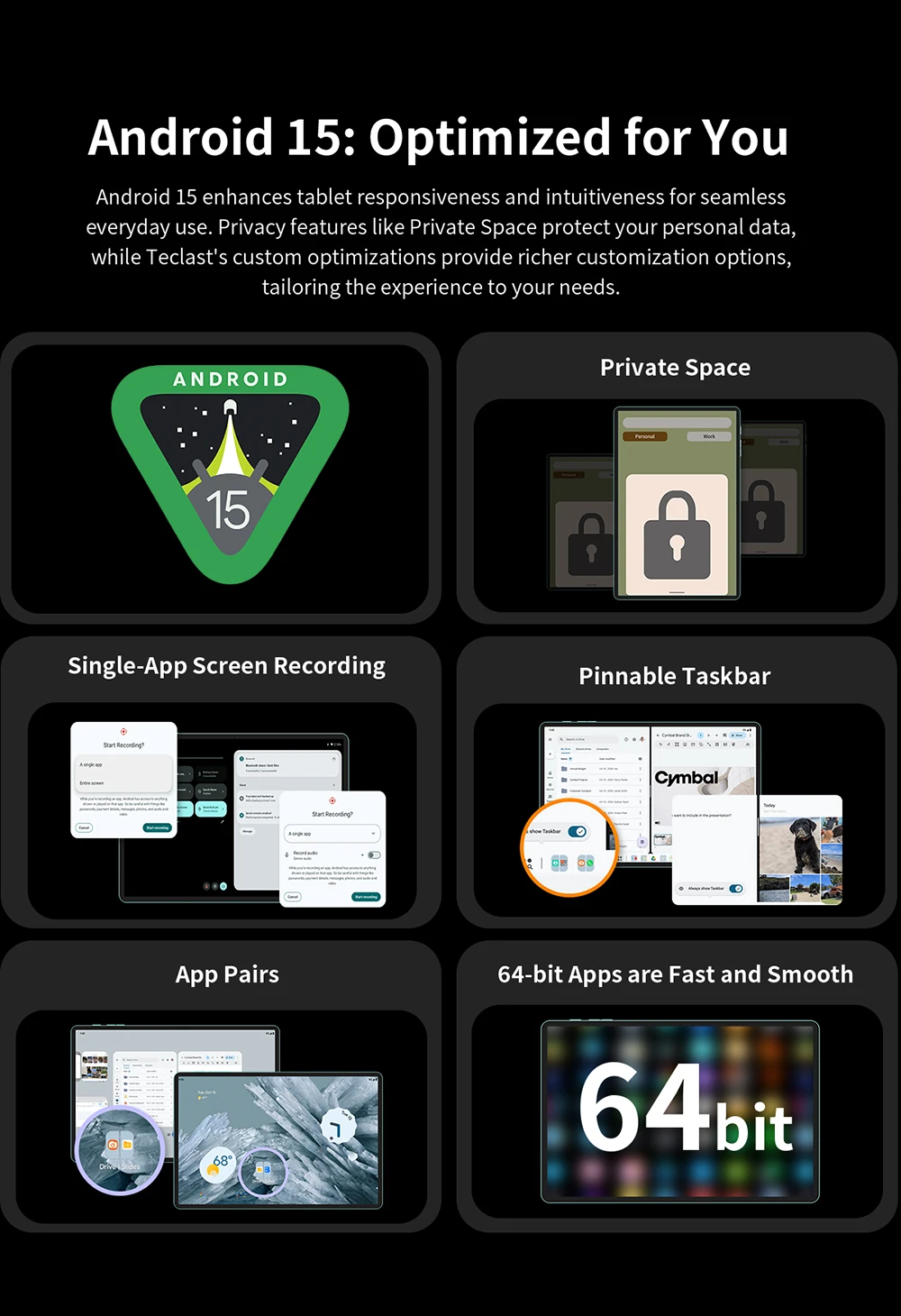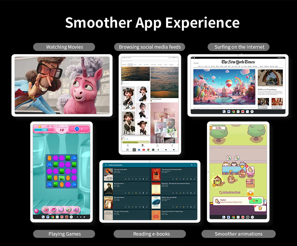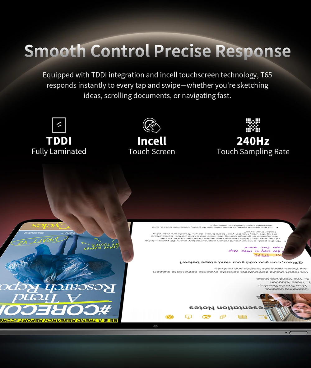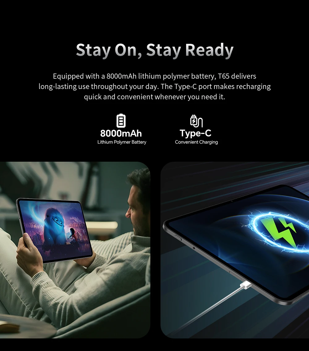 تعرف على T65: جهازك اللوحي العالمي الحقيقي.يدعم هذا الجهاز متعدد الاستخدامات بطاقتي SIM لاتصال 4G موثوق به في جميع أنحاء العالم، أو استخدم فتحة واحدة لبطاقة SIM والأخرى لما يصل إلى 1 تيرابايت من مساحة التخزين القابلة للتوسيع.نظرًا لتشغيل أحدث إصدار من Android 15 مع الوصول الكامل إلى Google Play وشهادة Widevine L1، فإنه يفتح البث عالي الدقة على منصات مثل Netflix.توفر الشاشة المذهلة مقاس 13.4 بوصة بدقة 2K، مع معدل تحديث يبلغ 120 هرتز، تجربة مشاهدة سلسة وغامرة بشكل استثنائي، مما يجعل T65 خيارًا مثاليًا للأفلام والمسلسلات.